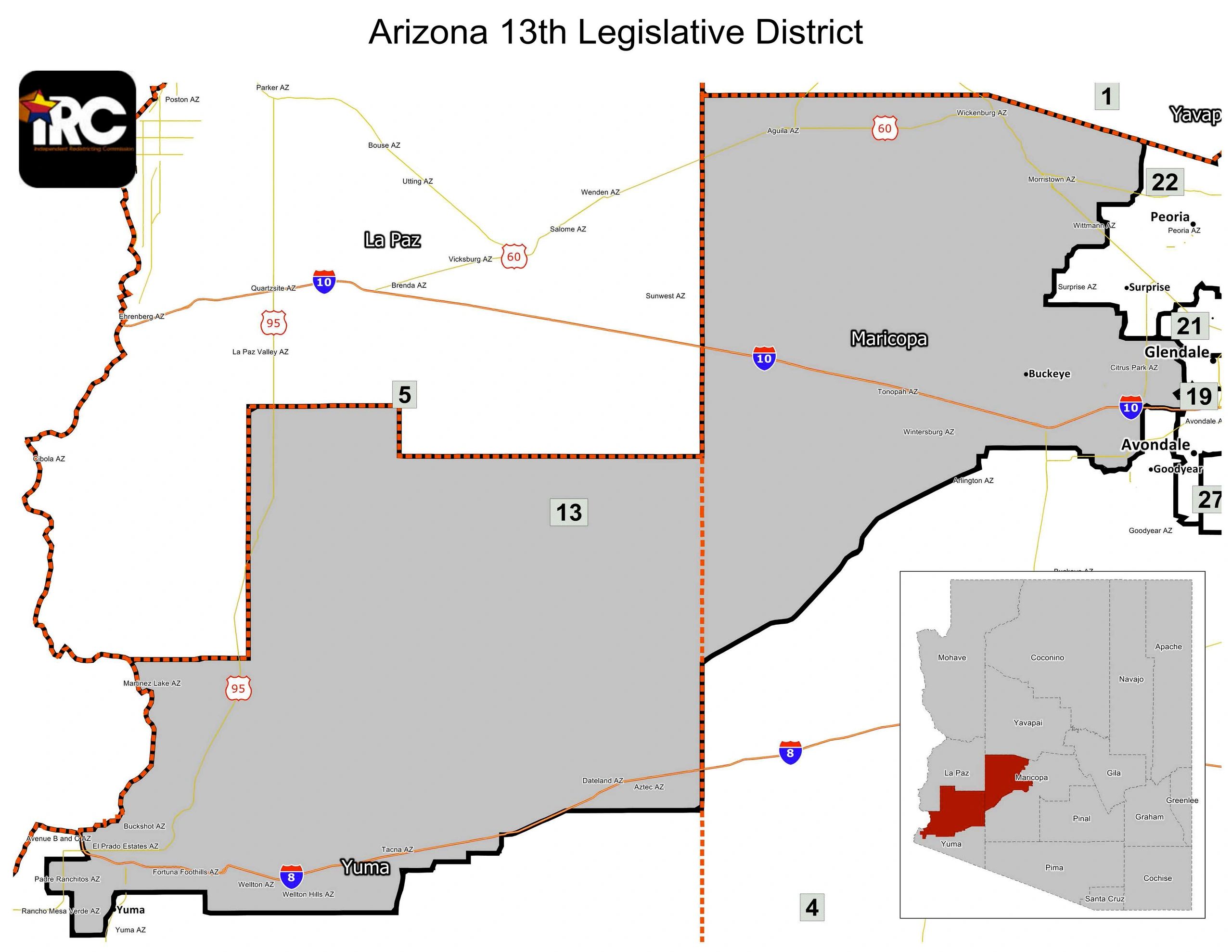 This is what is referred to as the "Yuma Legislative District Notch". From North to South: The L.D. 13 notch boundary starts at Interstate 8 and Pacific Avenue and runs South to 24th Street. It then turns West to Avenue D, then turns South to County 14th Street, then turns East to Avenue A, then turns South.
