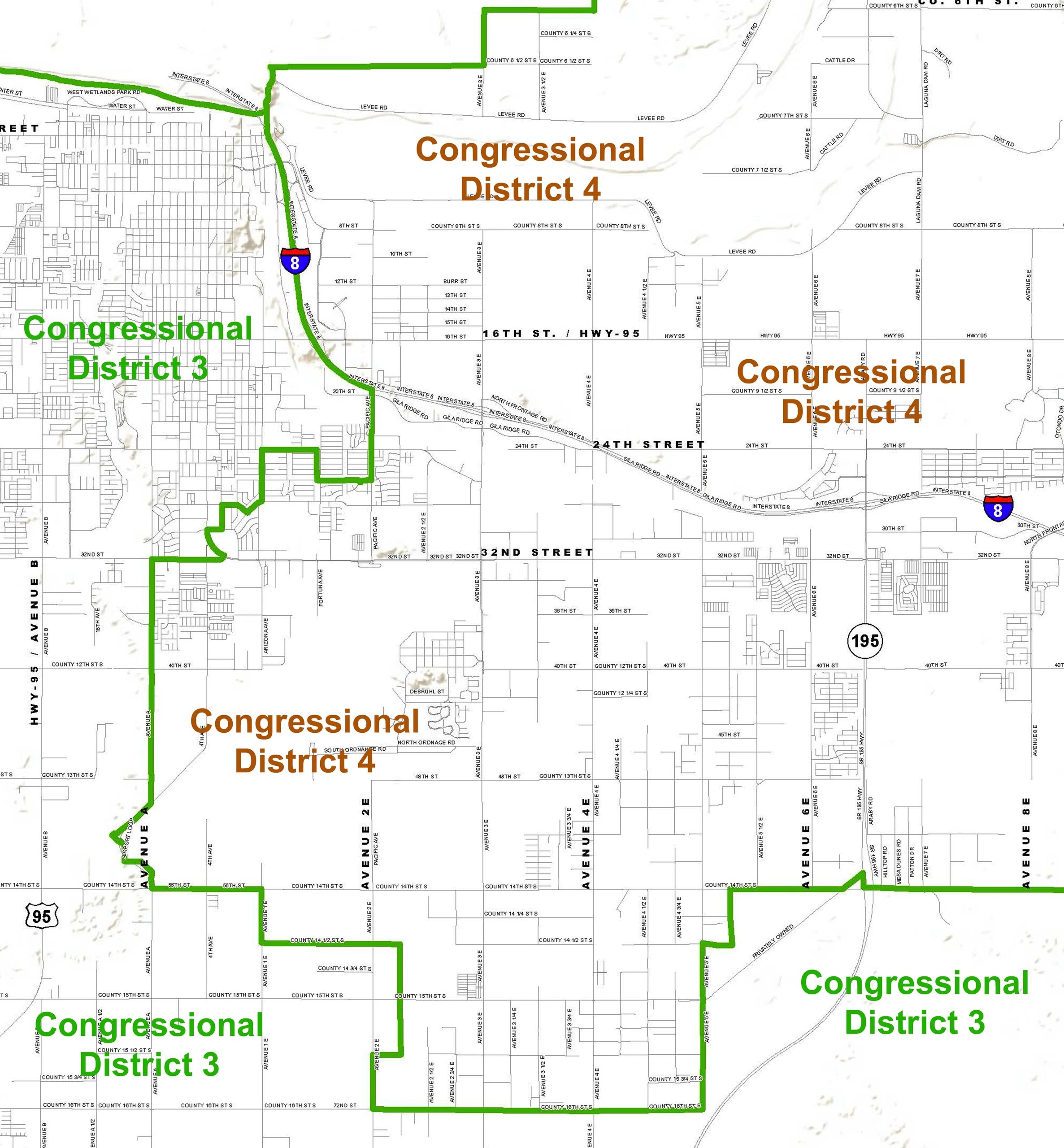 Yuma is a perfect example of a 'gerrymandered' city due to its haphazard voting boundaries that were put in place a few years ago. As indicated on the above map, the voting boundaries separating Congressional District 3 and Congressional District 4 meander through Yuma like a drunken turtle. The Redistricting Committee consisted of two Republicans, two Democrats and one neutral Independent. Independent - yeah, right!
